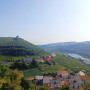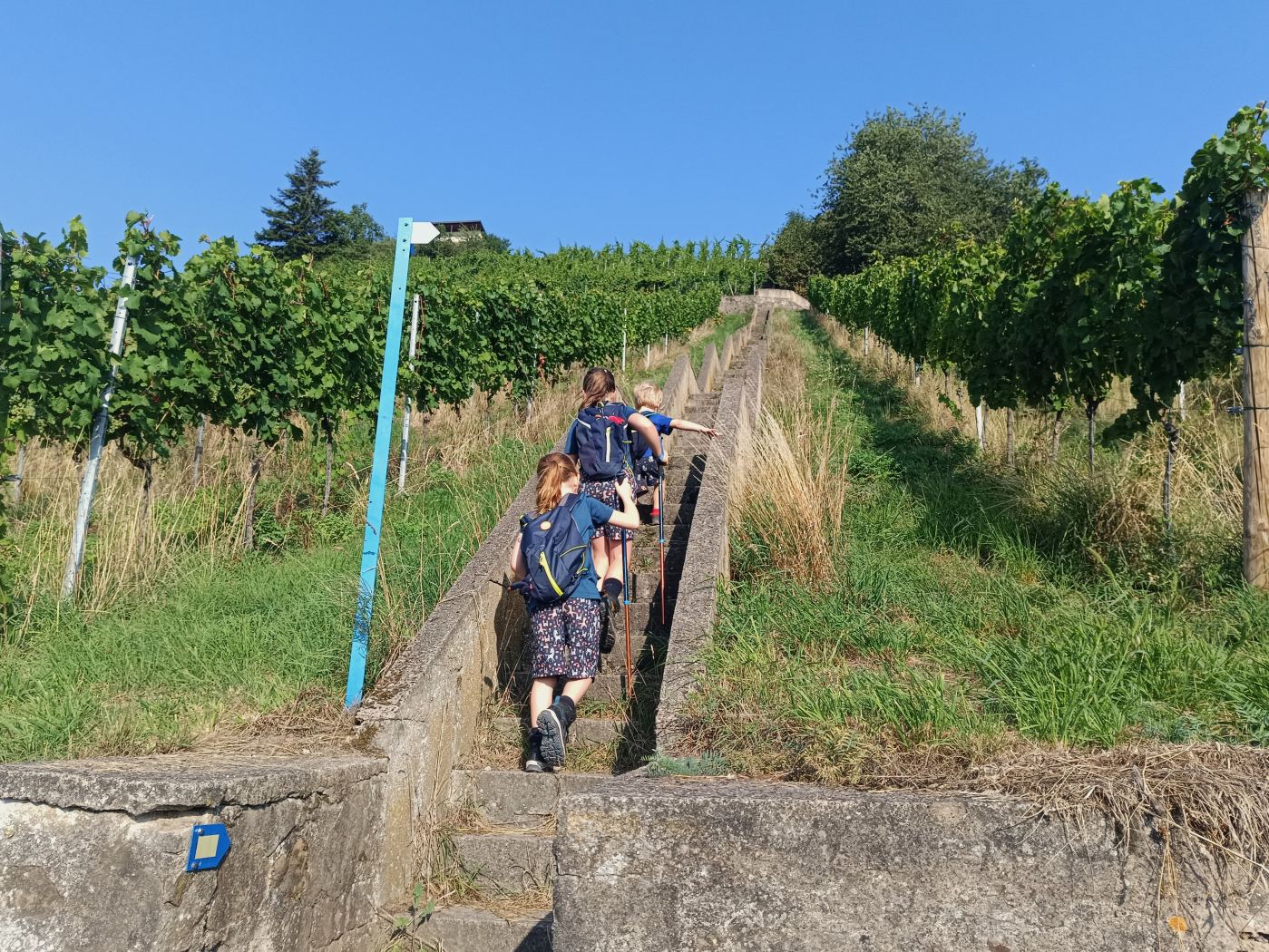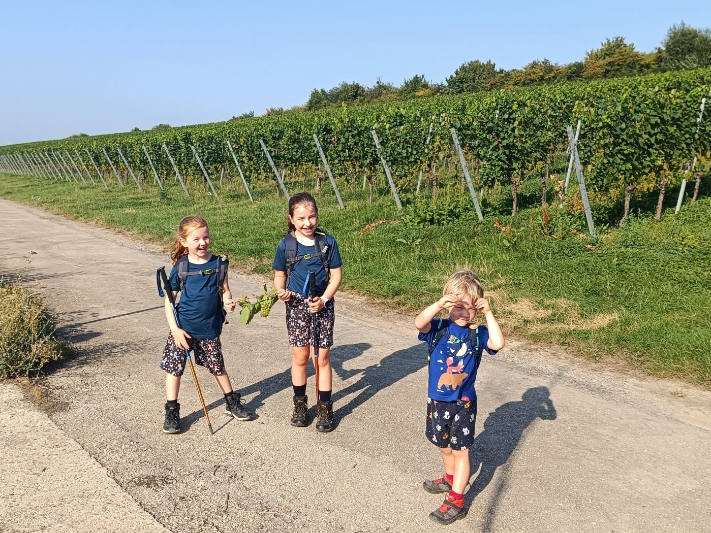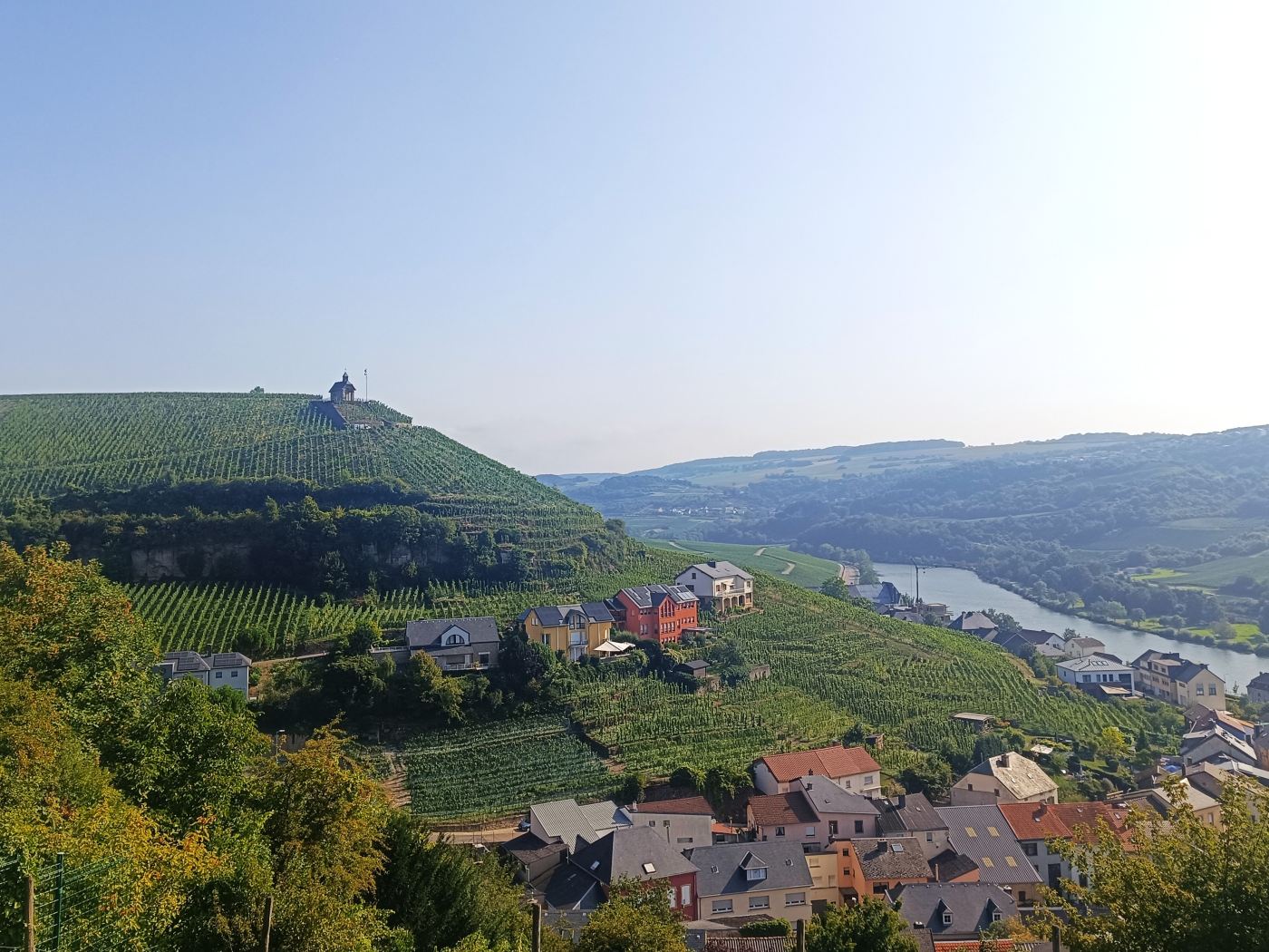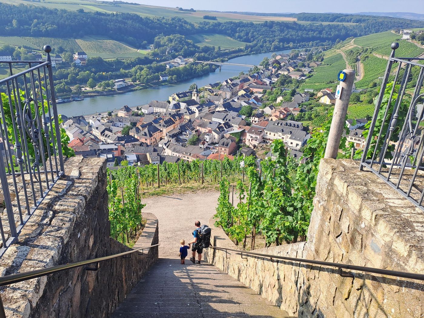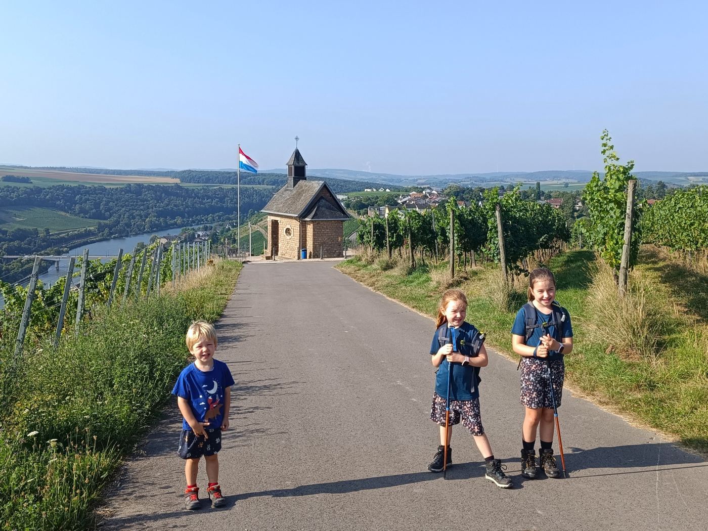 Al stijgend verlaten we het zeer rustige Ahn. De gele rechthoeken sturen ons langs de kerk en een doolhof?! De drang voor de kinderen is te groot om niet een kijkje te gaan nemen. Nadat we al snel merken dat we in het doolhof ook nog moeten klimmen en de kinderen de vele spinnendraden zien staan we snel terug aan de ingang en volgen we braaf de gewone markering. Op korte tijd stijgen we alweer 90 meter en bevinden we ons terug tussen de wijngaarden. Al gauw begint Leon te zeuren, dag 2 gaat altijd wat moeizamer voor hem. Ik sus hem met de gedachte dat hij straks 2x in de rugdrager mag, maar nu tot de kapel flink moet stappen. Het gezeur houdt plots op wanneer de markering ons naar rechts stuurt via een heel lang trappenpad! De kinderen vinden het, ondanks het klimmen, geweldig leuk om tussen de druiven naar boven te gaan. We stijgen een goede 30 meter en volgen dan opnieuw een asfaltweg die lichtjes afdaalt. In de verte doemt de Sint-Donaatskapel al op. Vanaf hier hebben we een prachtig uitzicht over de Moezel en het lager gelegen Wormeldange. Enkele wespen zorgen ervoor dat we snel doorstappen, Leon is alweer vergeten dat hij vanaf hier in de rugdrager mag en stapt gewoon verder. Ik zwijg…!