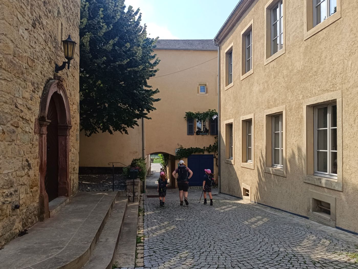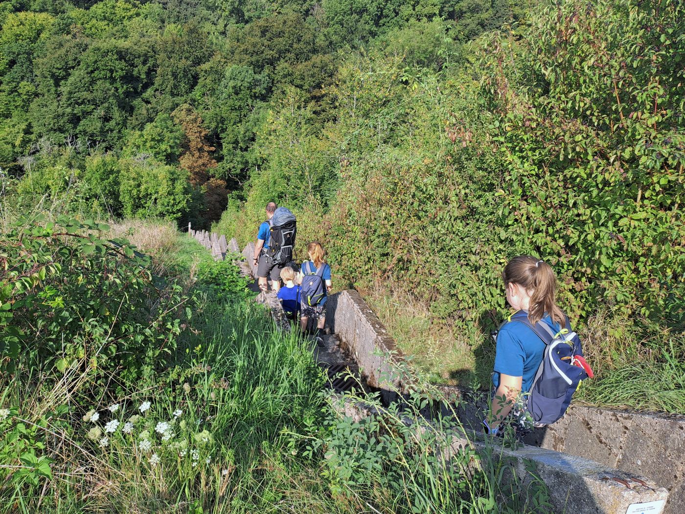 Wanneer we, na een goede nachtrust, om iets voor 7u wakker worden in onze pod is het buiten nog vrij fris. Wat een verschil met gisteren. We besluiten om dan maar binnen te ontbijten, omdat het voor de kinderen nog te fris is. De sandwiches worden gesmeerd en alles wordt ingeladen, want deze avond rijden we, na de wandeling, naar de jeugdherberg van Bollendorf. Daar hebben we al eens geslapen en na 2 nachten in een pod hunkeren we terug naar iets meer comfort, hoewel de pod op de camping zeker zijn charme had en een prima prijs/kwaliteit heeft. De dame van de camping Route de la Vin verdient trouwens een pluim! We werden er heel hartelijk ontvangen en niets was te veel. Een adres dat we in ons achterhoofd houden! Om iets over 8u vertrekken we met de auto en rijden we naar Ahn, voor een keertje parkeren we de auto aan het startpunt. Er rijden toch genoeg bussen op deze zaterdag, dus de rit terug doen we straks wel. Om iets over half negen zijn we klaar om erin te vliegen. Ondertussen is het al veel warmer, maar nog niet zo warm is gisteren gelukkig! Het zou vandaag ook maar 27° worden.