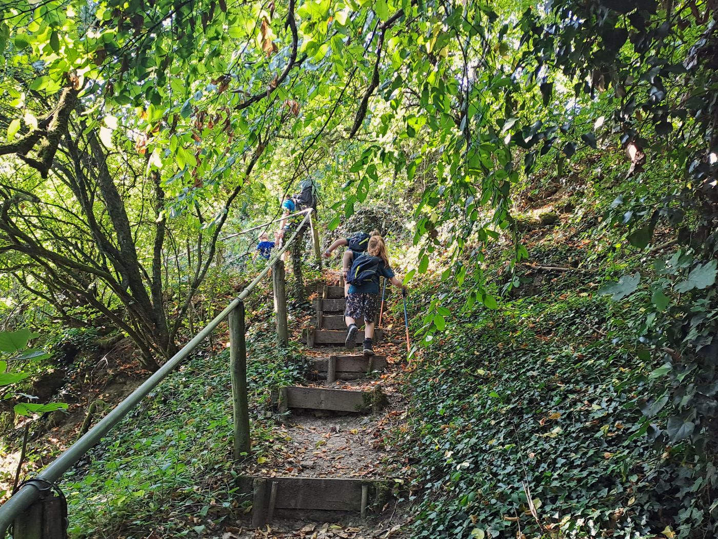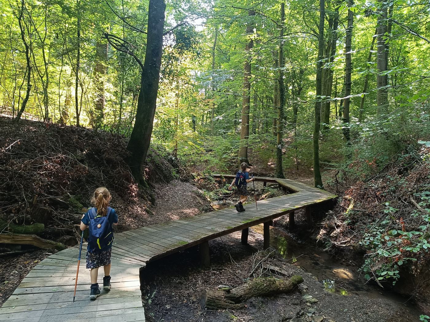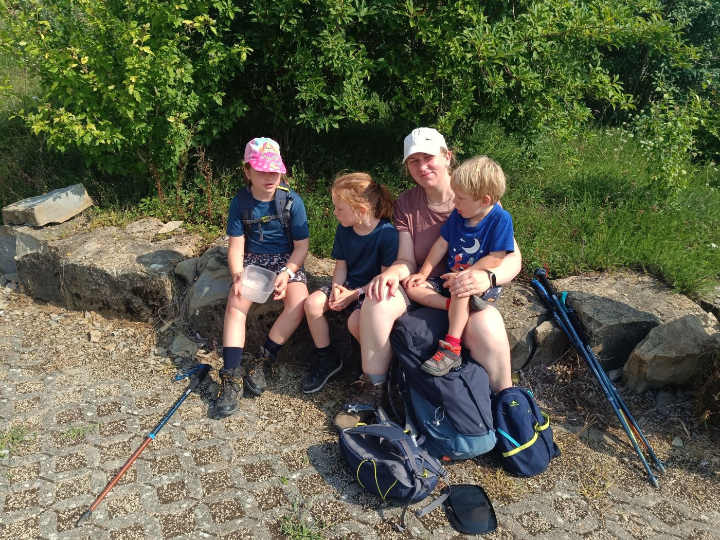 Na een aangename rustpauze (zonder al te veel vervelende wespen) stappen we na een half uurtje verder. Leon heeft duidelijk hernieuwde energie want hij trekt de kop en gaat al spelend als een achtbaan naar beneden. Af en toe stopt de achtbaan om de zusjes te laten instappen en dan gaat hij er weer vandoor. In geen tijd bereiken we het centrum van Stadtbredimus. Nadat we opnieuw de kerk hebben gepasseerd is het tijd voor de laatste klim van de dag. Dat is er wederom eentje om U tegen te zeggen. Eerst gaat het nog vrij gematigd omhoog tot aan een bosrand. Daarna volgt een soort fit-o-meter pad. Er staan paaltjes waar je afwisselend spurtjes naar boven moet trekken. Niets voor mij, maar Marie geeft niet op en houdt vol tot boven! Je zou denken dat we in het bos eindelijk van het asfalt zouden af zijn, maar niets is minder waar. Tot aan het riviertje Heedbach blijven we over verharde ondergrond stappen. Maar dan volgt er nog een prachtig stuk langs deze rivier. We volgen een wandeling voor kinderen: borden met figuren, opdrachten en véél bruggetjes. Wat is dat genieten na een hele dag stappen op het asfalt. Leon is niet te stoppen, zo snel gaan we vooruit. Wanneer we het bos verlaten brengen enkele trapjes ons naar de Moezelkade. We naderen het toeristische Remich. Net voordat we ons aan de Belgische kust wanen gaan we rechtsaf en klimmen we opnieuw. We stappen tot aan de bushalte Remich Schoul, zodat de volgende etappe wat korter is. We zijn wederom net op tijd om de bus van 14:51 te halen. Via een overstap aan het busstation van Remich bereiken we opnieuw Ahn waar we onze auto hadden achtergelaten. We belonen de kinderen nog met een bezoek aan het waterspraypark van Mertert (hier kwamen we in juli nog voorbij met de GR 5). Nadien rijden we naar de jeugdherberg van Bollendorf waar we ons installeren in een lekker koele kamer. Het avondeten smaakt wederom en na een kort bezoek aan de speeltuin is het alweer tijd om te gaan slapen. Morgen lassen we een rustdag in zodat we maandag opnieuw verder kunnen stappen!