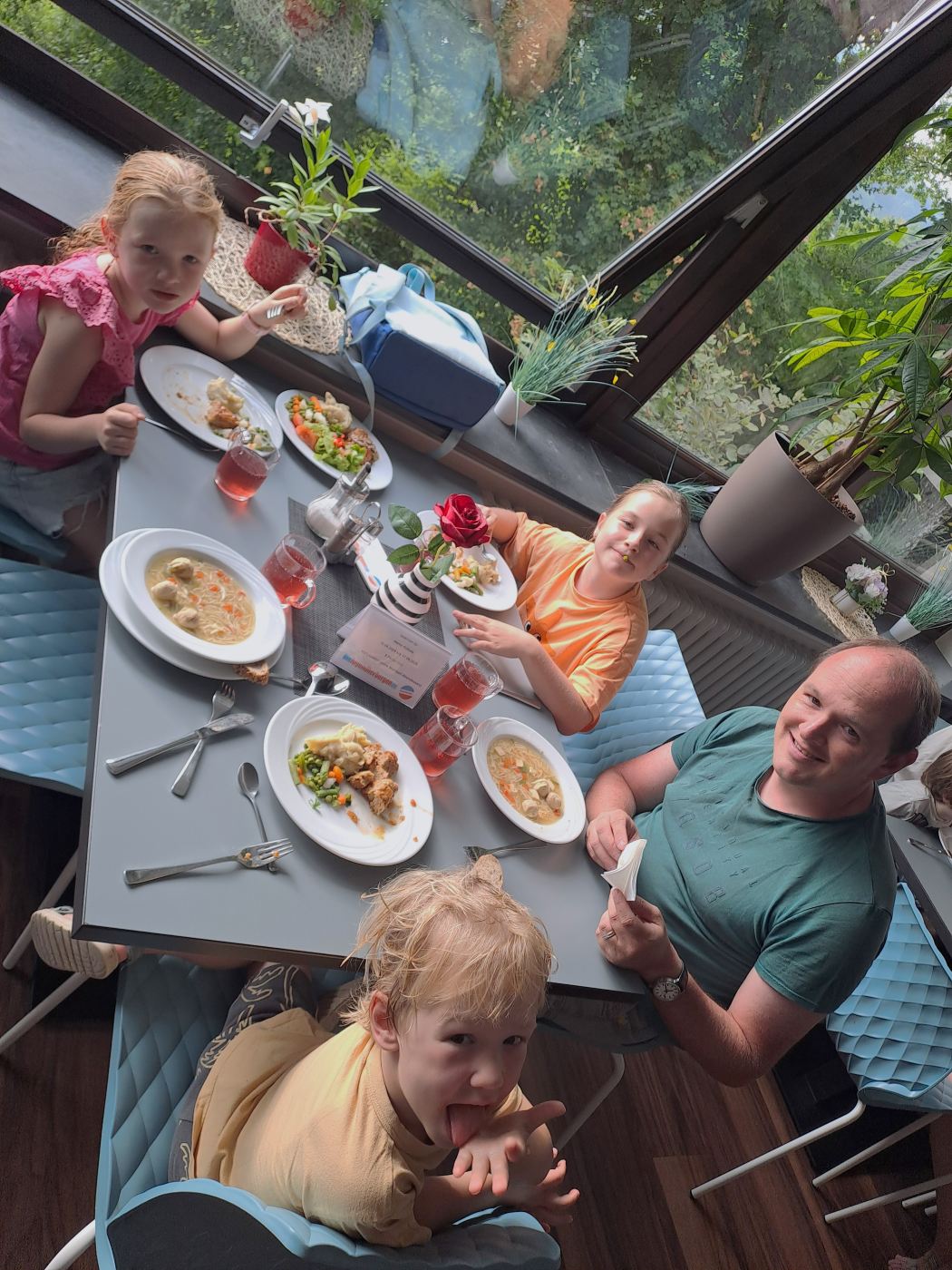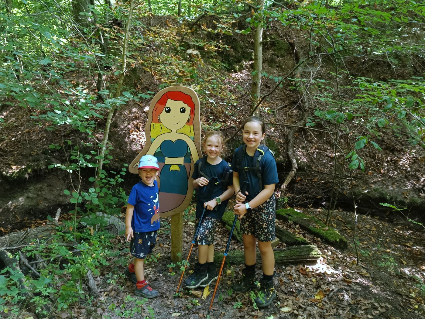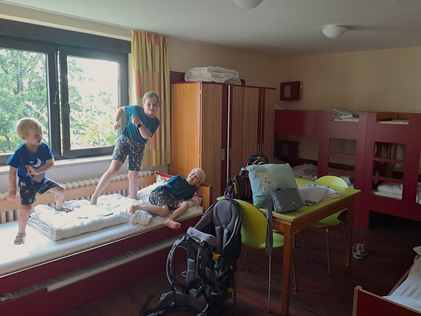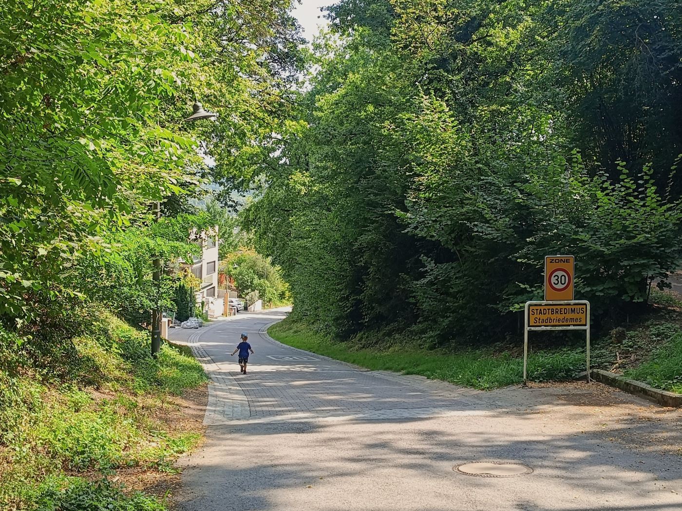 Na een aangename rustpauze (zonder al te veel vervelende wespen) stappen we na een half uurtje verder. Leon heeft duidelijk hernieuwde energie want hij trekt de kop en gaat al spelend als een achtbaan naar beneden. Af en toe stopt de achtbaan om de zusjes te laten instappen en dan gaat hij er weer vandoor. In geen tijd bereiken we het centrum van Stadtbredimus. Nadat we opnieuw de kerk hebben gepasseerd is het tijd voor de laatste klim van de dag. Dat is er wederom eentje om U tegen te zeggen. Eerst gaat het nog vrij gematigd omhoog tot aan een bosrand. Daarna volgt een soort fit-o-meter pad. Er staan paaltjes waar je afwisselend spurtjes naar boven moet trekken. Niets voor mij, maar Marie geeft niet op en houdt vol tot boven! Je zou denken dat we in het bos eindelijk van het asfalt zouden af zijn, maar niets is minder waar. Tot aan het riviertje Heedbach blijven we over verharde ondergrond stappen. Maar dan volgt er nog een prachtig stuk langs deze rivier. We volgen een wandeling voor kinderen: borden met figuren, opdrachten en véél bruggetjes. Wat is dat genieten na een hele dag stappen op het asfalt. Leon is niet te stoppen, zo snel gaan we vooruit. Wanneer we het bos verlaten brengen enkele trapjes ons naar de Moezelkade. We naderen het toeristische Remich. Net voordat we ons aan de Belgische kust wanen gaan we rechtsaf en klimmen we opnieuw. We stappen tot aan de bushalte Remich Schoul, zodat de volgende etappe wat korter is. We zijn wederom net op tijd om de bus van 14:51 te halen. Via een overstap aan het busstation van Remich bereiken we opnieuw Ahn waar we onze auto hadden achtergelaten. We belonen de kinderen nog met een bezoek aan het waterspraypark van Mertert (hier kwamen we in juli nog voorbij met de GR 5). Nadien rijden we naar de jeugdherberg van Bollendorf waar we ons installeren in een lekker koele kamer. Het avondeten smaakt wederom en na een kort bezoek aan de speeltuin is het alweer tijd om te gaan slapen. Morgen lassen we een rustdag in zodat we maandag opnieuw verder kunnen stappen!