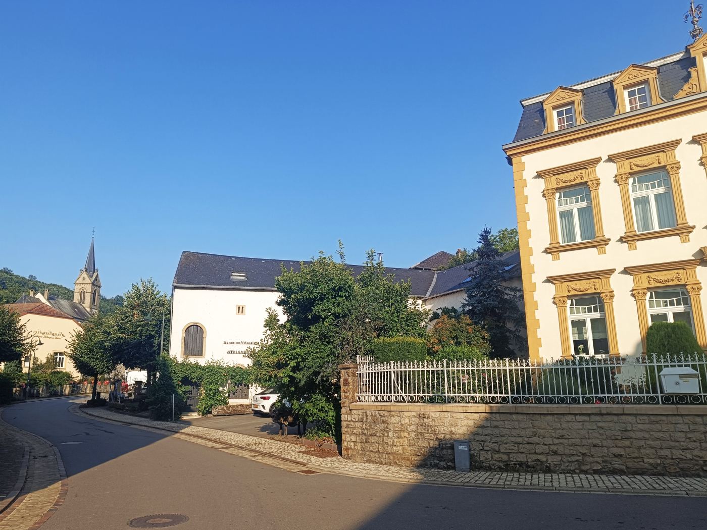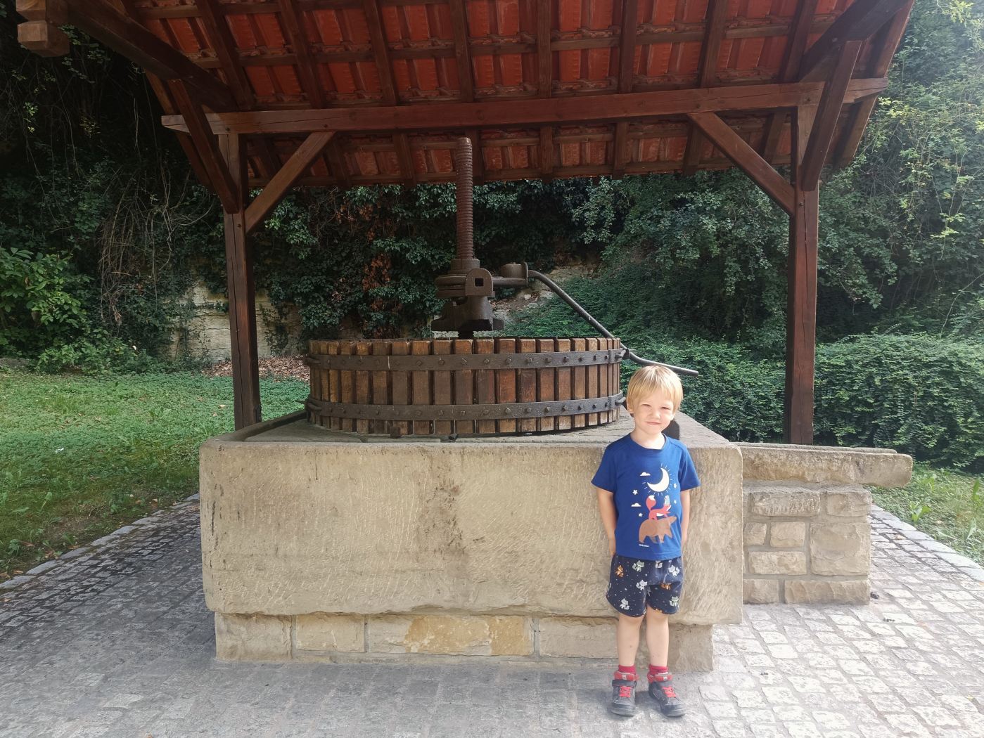 Wat een plezier! Nog meer trappen zorgen ervoor dat we snel afdalen naar Wormeldange, de hoofdstad van de Riesling. Leon merkt een oude druivenpers op (elk dorp heeft er hier zo wel een deel staan) en na het oversteken van de Aalbaach krijgen we een van de weinige niet geasfalteerde paden. We moeten opnieuw klimmen en Leon, die trekt zelfs de kop! Eens boven wijken we voor één keer af van de bewegwijzering (foei !). In plaats van een stuk langs de CR122 wandelen we via trappen naar beneden en daarna verder op de route. We hebben gemerkt dat er soms wel onnodige en vreemde trajecten zitten langs drukke wegen in de Sentier de la Moselle. Enfin, het is 500 meter korter en mooier. Tijd om de route nog eens onder handen te nemen. We verlaten Wormeldange Haut en stappen verder tussen de druiven. Een zitbank die aangeduid staat op de openstreetmap kaart ligt op privé eigendom. We installeren ons dan maar op het enkele stenen langs de parking van een wijngaardenier. Het fruit is snel op, laat ons hopen dat de snelle suikers ons de nodige energie geven. Leon gaat in de rugzak, hij heeft namelijk flink 5 km gestapt en we dalen lichtjes af naar het volgende dorpje: Ehnen. De route is hier blijkbaar omgelegd en komt niet meer langs het historische ezelsbruggetje over de Ehnerbaach maar gaat door het centrum.