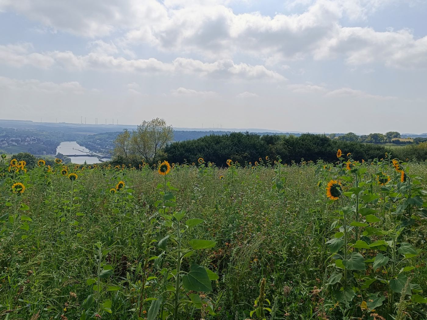 We laten Ehnen achter ons en dus beginnen we wederom te klimmen. Er zijn nog zekerheden hier aan de Luxemburgse Moezel. Gelukkig is het maar eventjes doorbijten en wanneer we tussen de wijngaarden zitten gaat het opnieuw vlak verder. De Moezel maakt een bocht en wij doen dat ook, maar dan in de andere richting. De GR 5 wijkt af van de rivier naar Greiveldange zodat we een grote bocht van de Moezel kunnen afsnijden. We dalen af naar de bebouwde kom en dan is het opnieuw tijd om te klimmen. Eerst via de weg, daarna snijden we een klein stukje af via enkele trappen. Leon ziet de trappen en wil terug zelf stappen, dat laat ik mezelf geen twee keer zeggen! Natuurlijk valt het hem tegen dat het maar 10 treden zijn. We trekken opnieuw verder tussen de druivenvelden en spelen ondertussen wat raadspelletjes met de kinderen. We passeren een, schijnbaar, gekraakte woning, maar ook een mooi zonnebloemveld. Regelmatig zien we wilde bloemen en ook bijenkasten. Het is ondertussen al na 12u30 en de eerste picknick bank kunnen we niet gebruiken, want ze staat bij een afgesloten helipad. Verderop is er volgens de kaart nog een BBQ plaats; daar moet een bank zijn! En ja hoor, na 12 km stappen treffen we een prachtige rustplaats.